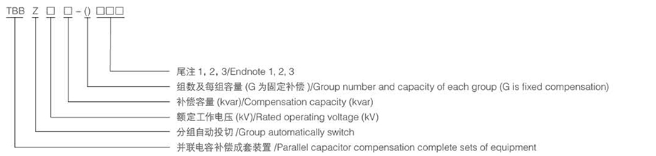 例如:TBZ10-1500(600+900)-AK 表示電壓為10kV, 裝置容量為1500kvar,分兩組自動(dòng)投切,一組 600kvar,一組 900kvar, 單星型接線,開口三角電壓保護(hù)。