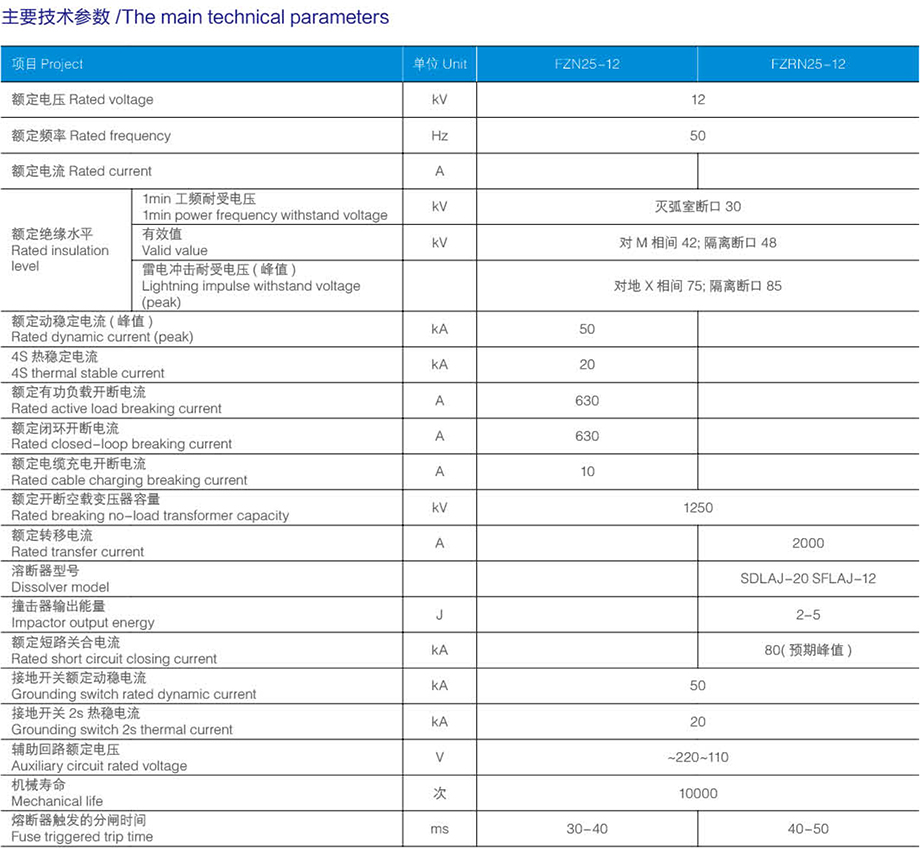 FZRN25-12 戶內(nèi)高壓真空負(fù)荷開關(guān)熔斷器組合電器是三相交流 50Hz, 額定電壓12kV 的戶內(nèi)裝置,適用于工礦企業(yè)配電所及變站等場合,作負(fù)荷控制和短路保護(hù)之用。配裝的接地開關(guān),可以承受短路電流。操動機構(gòu)可手動合電動,便于實現(xiàn)電力系統(tǒng)的三遙控要求。